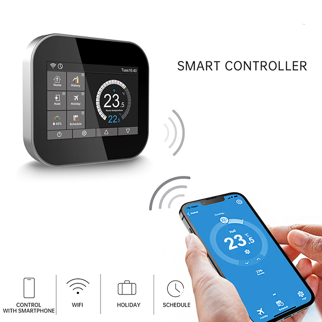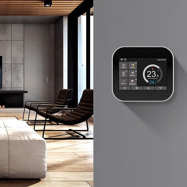 Программируемый термостат с цветным сенсорным экраном TFT и с WiFi для управления системой электрического теплого пола на 16 А.